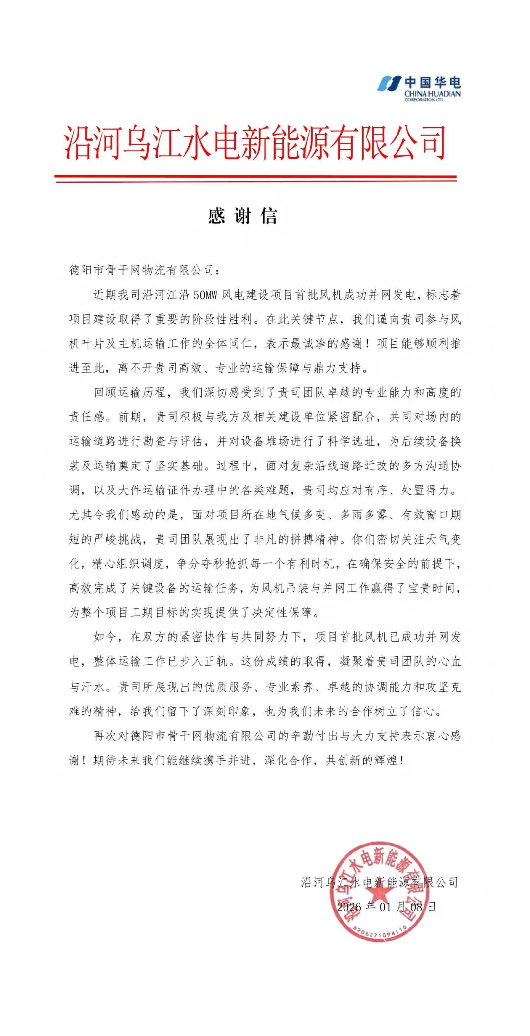 近日,中国华电集团有限公司所属沿河乌江水电新能源有限公司向省骨干网公司所属德阳骨干网公司致感谢信,对德阳骨干网公司承运的沿河江沿50MW风电项目首批风机成功并网发电过程中所提供的优质、高效、专业的运输服务给予高度肯定并致以诚挚感谢。
